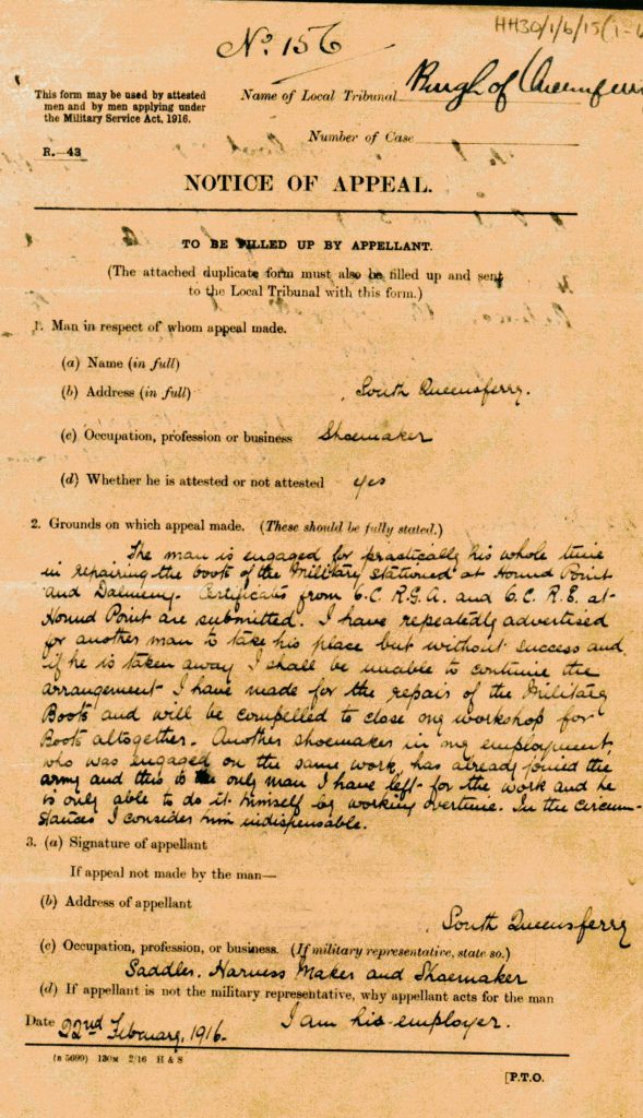 Employers appealed to the local Military Tribunals on behalf of their employees, and Estate Owners usually applied to the county tribunals. Some had already lost workers either to enlistment or conscription. Most of the employers were doing work for the war effort such as the local saddler and shoemaker Robert Ruthven who repaired boots for the army, he appealed on behalf of shoemaker John Mill, but his appeal was dismissed. Employers could be given time to find replacements but not always.