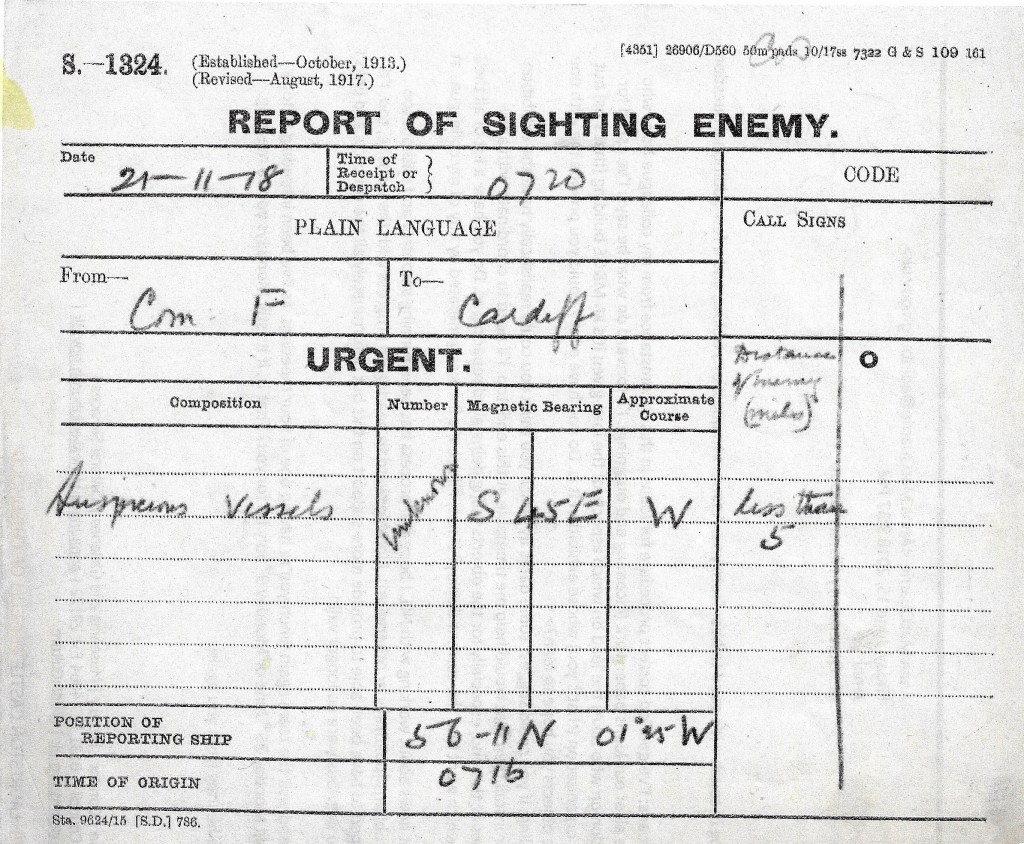 Commodore Hugh Tweedie (Commodore F) was given the task of taking his destroyer flotillas from Port Edgar on the 20th November to meet the German fleet. Approaching the rendezvous point early in the morning of the 21st, he deployed his destroyers in a formation some 5 miles wide and made contact with the Germans at 0715, as this signal shows.