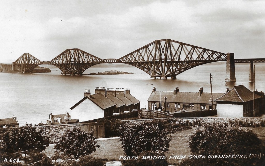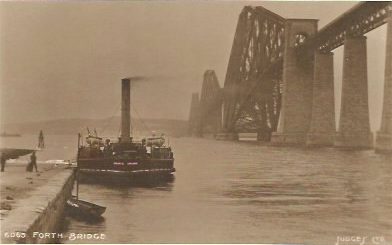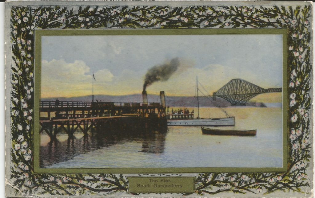 The Galloway Saloon Steam Packet Company of Leith built a wooden pier in 1886 for passengers to embark or disembark at Queensferry harbour. The pier (Galloway’s Pier) was in use as a steamer destination until 1914 when the Firth of Forth was declared a controlled area and passenger trips ended. The ship is probably P.S. Lord Morton. The point where the bridge “comes ashore” at North Queensferry does not look right. Was the picture taken before the bridge was completed and artistic licence employed?
