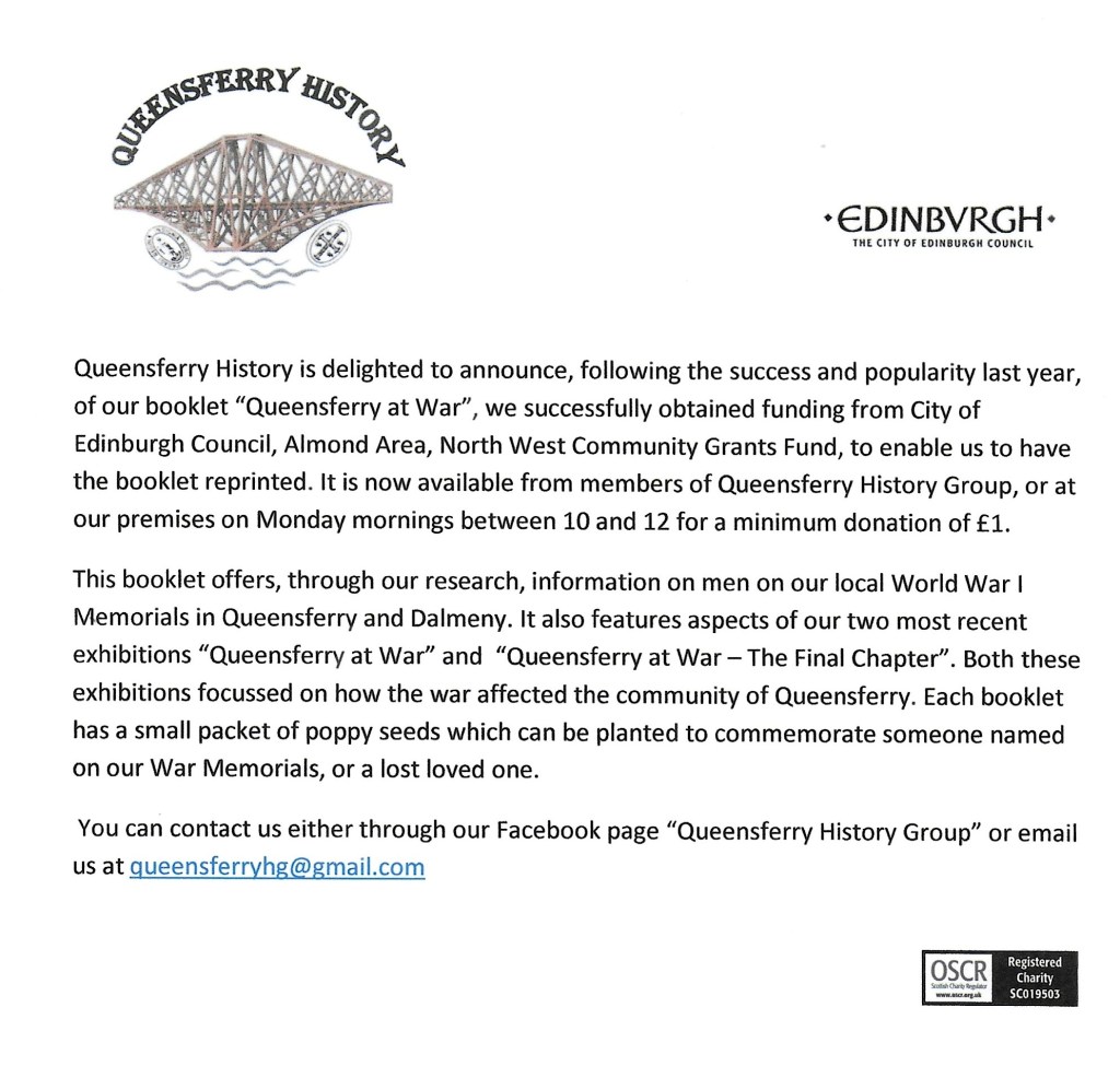 This booklet is now available for a donation of £1 per book, at Queensferry Library, hours Monday and Tuesday 1pm – 8pm, Tuesday, Thursday, Friday and Saturday 10am – 5pm. Also available from Allium. We will be distributing around more places in Queensferry over the next few weeks.