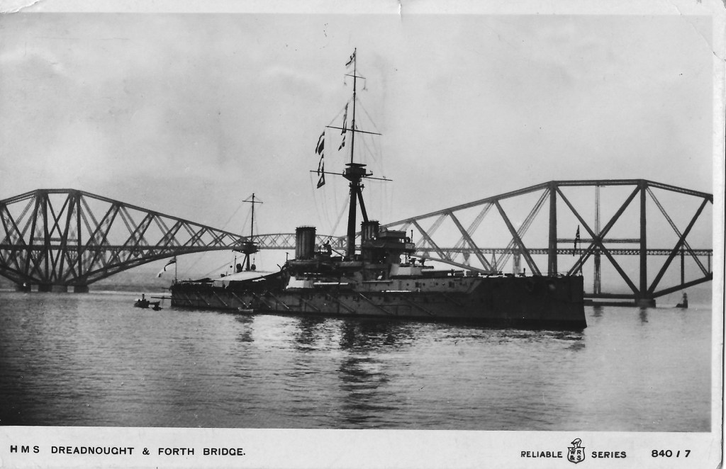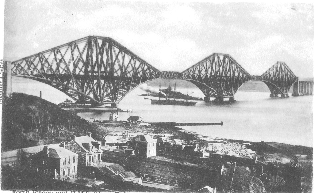 According to the inscription, this postcard shows HMS Iron Duke below the Forth Bridge. She was an “Ironclad”, launched in 1870 and served as guardship in1890, just before she was decommissioned.