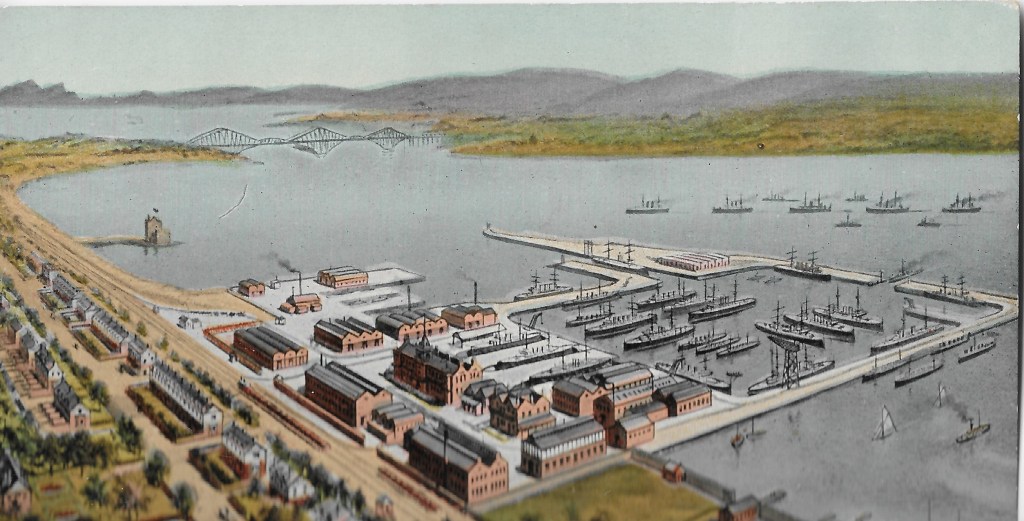 In 1903 the government decided to build a new naval base in Scotland to protect against the growing threat from Germany. The site chosen was Rosyth. Work began in 1909 and the base was still unfinished when war broke out in 1914. This postcard shows an artist’s impression of the base from 1903. Rosyth Castle can be seen in the bay to the east of the dockyard. It is still there, but is swallowed up by the base.
