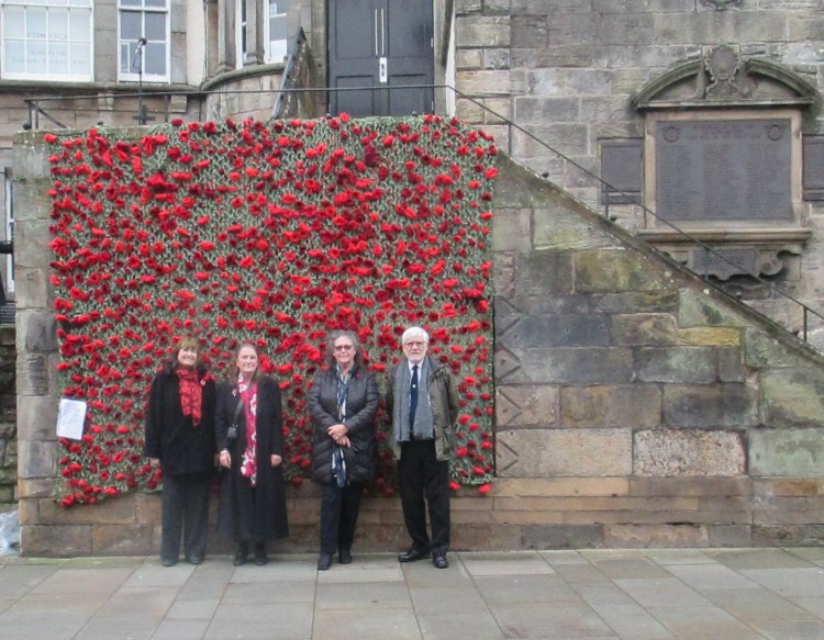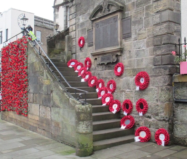 Early in the morning we hung the poppy drape at Rosebery Hall where the service would be held, beside the War Memorials. This poppy drape was a community project initiated by Queensferry History Group, in 2018, to commemorate the 100th Anniversary of the end of WWI.